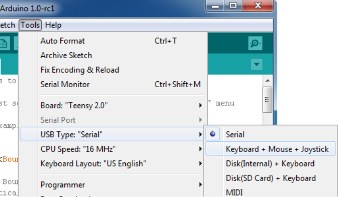 Teensy supports multiple USB configurations. Under Tools → USB Type, select the appropriate mode so the board can manage serial communication while operating with USB Host functionality. Teensyduino is also compatible with many Arduino libraries.