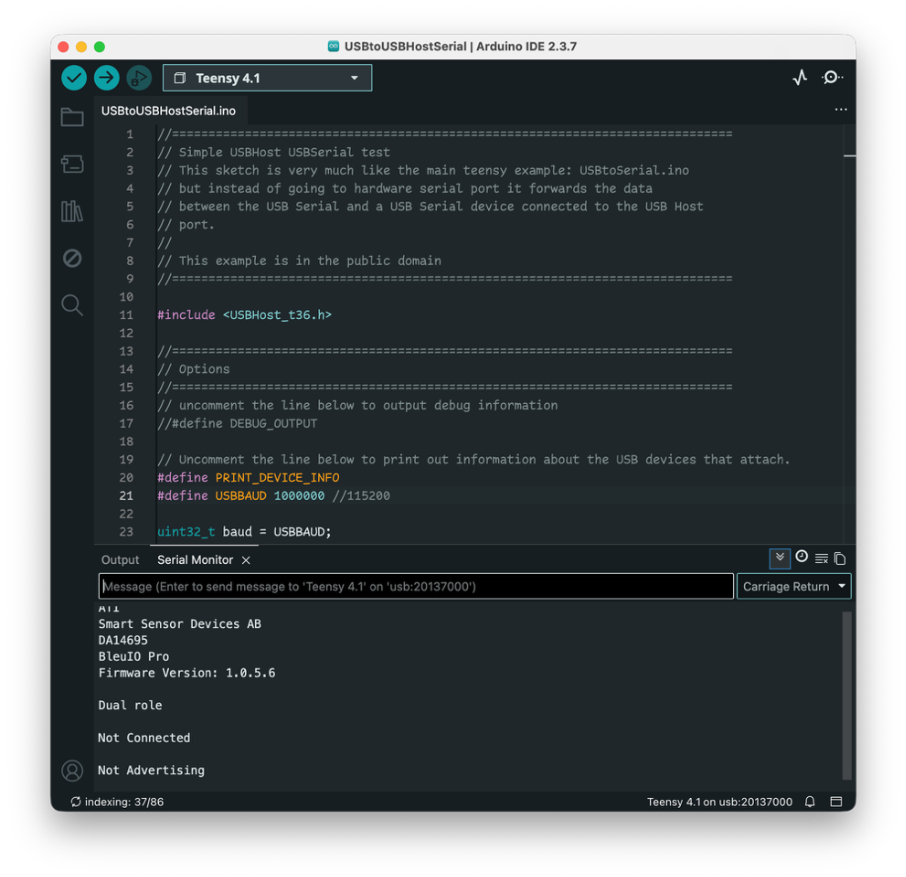 Upload the provided USBtoUSBHostSerial.ino sketch to the Teensy 4.1 using the Arduino IDE. This sketch initializes the USB Host interface and establishes a communication bridge between the Teensy and the BleuIO dongle. Once programmed, the Teensy essentially becomes a serial terminal for BleuIO, allowing you to type AT commands through the Arduino Serial Monitor and receive responses in real time.