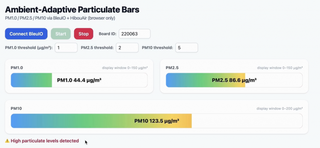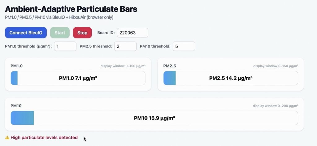UI behavior. Each metric drives a bar that fills left-to-right as the value rises within its display window. Thresholds are configurable (defaults: PM1.0 1, PM2.5 2, PM10 5 µg/m³). If any metric is at or above its threshold, the page shows “High particulate levels detected.”