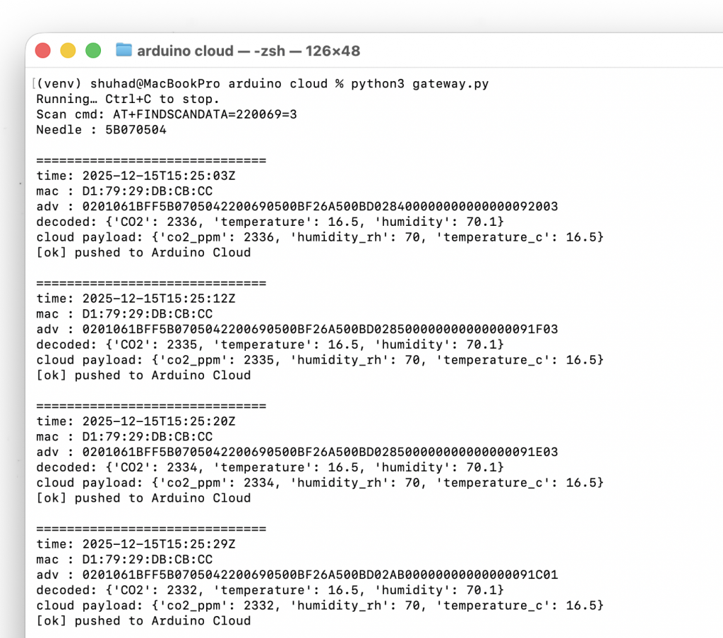 When the gateway script is executed, BleuIO is placed into dual-role mode and begins scanning for BLE advertisements that match the specified HibouAir board identifier. As advertisement packets are received, the script decodes the sensor values and immediately publishes them to Arduino Cloud. Within moments, the dashboard begins displaying live air quality data. This continuous loop allows the system to operate as a real-time BLE-to-cloud gateway with minimal overhead.